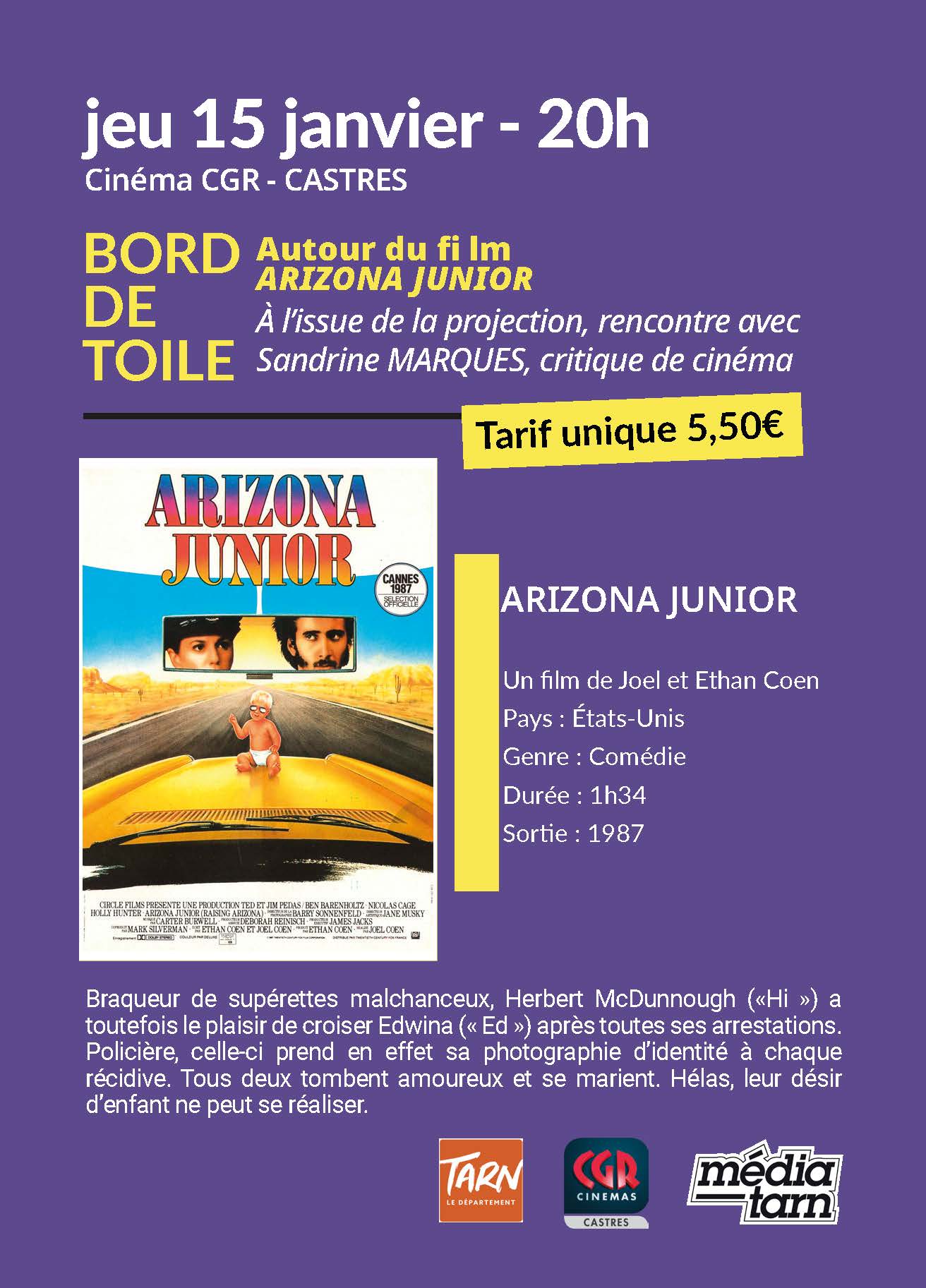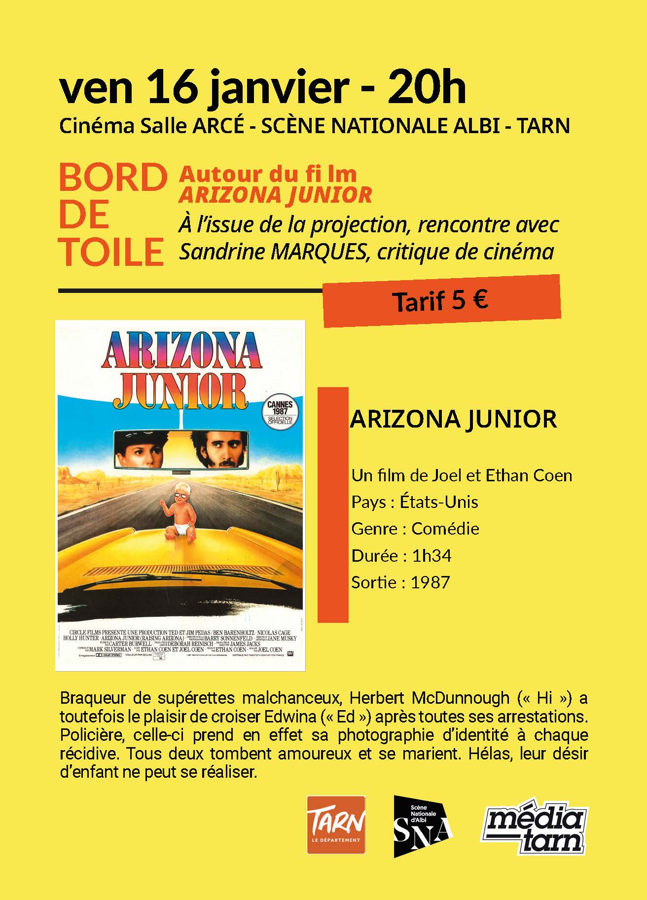 RENDEZ-VOUS le jeudi 15 janvier à 20h à Castres (CGR) et le vendredi 16 janvier à 20h à Albi (cinéma de la SNA-Tarn) autour du film Arizona Junior de Joel Coen & Ethan Coen (1987, 1h34, VOSTF).